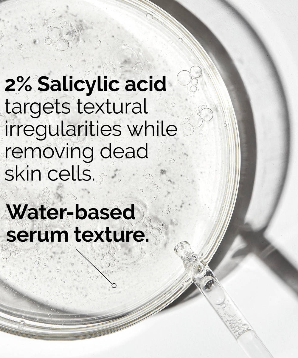 يقوم محلول حمض الساليسيليك 2% بتقشير الجدران الداخلية للجلد بلطف، وينظف البشرة ويصفيها. لاستخدامه مباشرة على العيوب فقط، يقلل هذا الحمض القوي من الاحمرار والالتهاب بشكل واضح من خلال استهداف المسام المحتقنة.