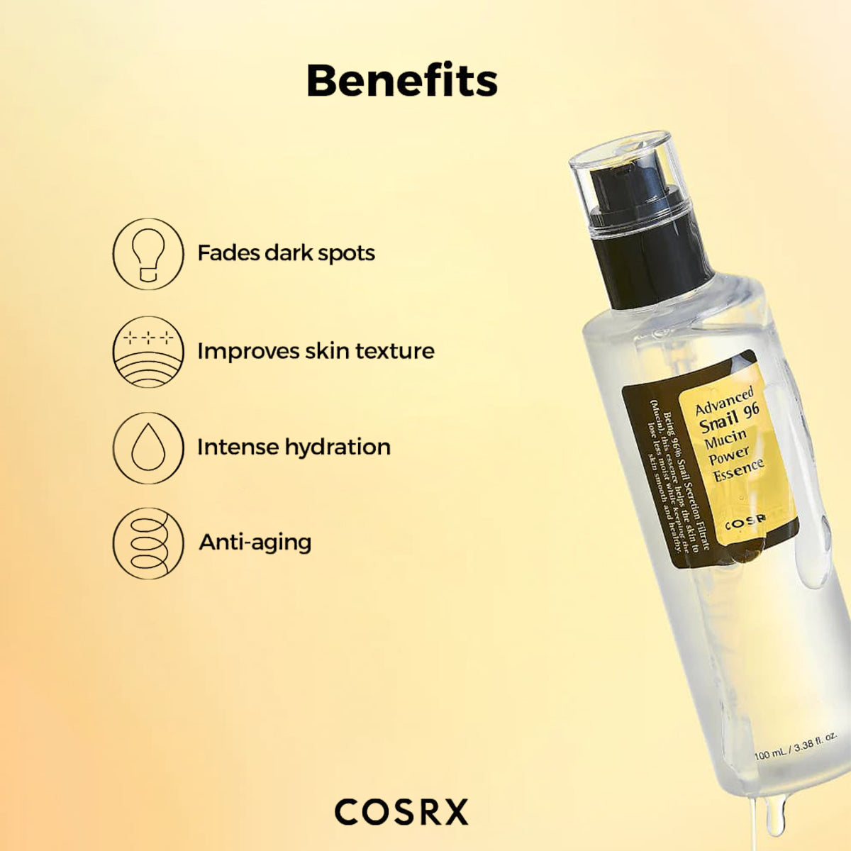 خلاصة العناية بالبشرة المتوهجة. احصل على هذا التوهج مع Advanced Snail 96 Mucin Power Essence. يتغلغل هذا الجوهر خفيف الوزن على الفور في البشرة للحصول على رطوبة منعشة تساعد على تحسين مرونة البشرة. هذا الجوهر غني بمرشح إفراز الحلزون؛ مكون عجيب من كي بيوتي يساعد على حماية البشرة من فقدان الرطوبة. لم يتم الإساءة إلى الحيوانات لتصنيعه.